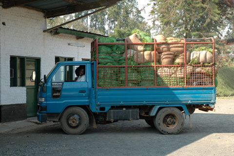 Un véhicule amène les sacs de feuilles de thé fraîches |